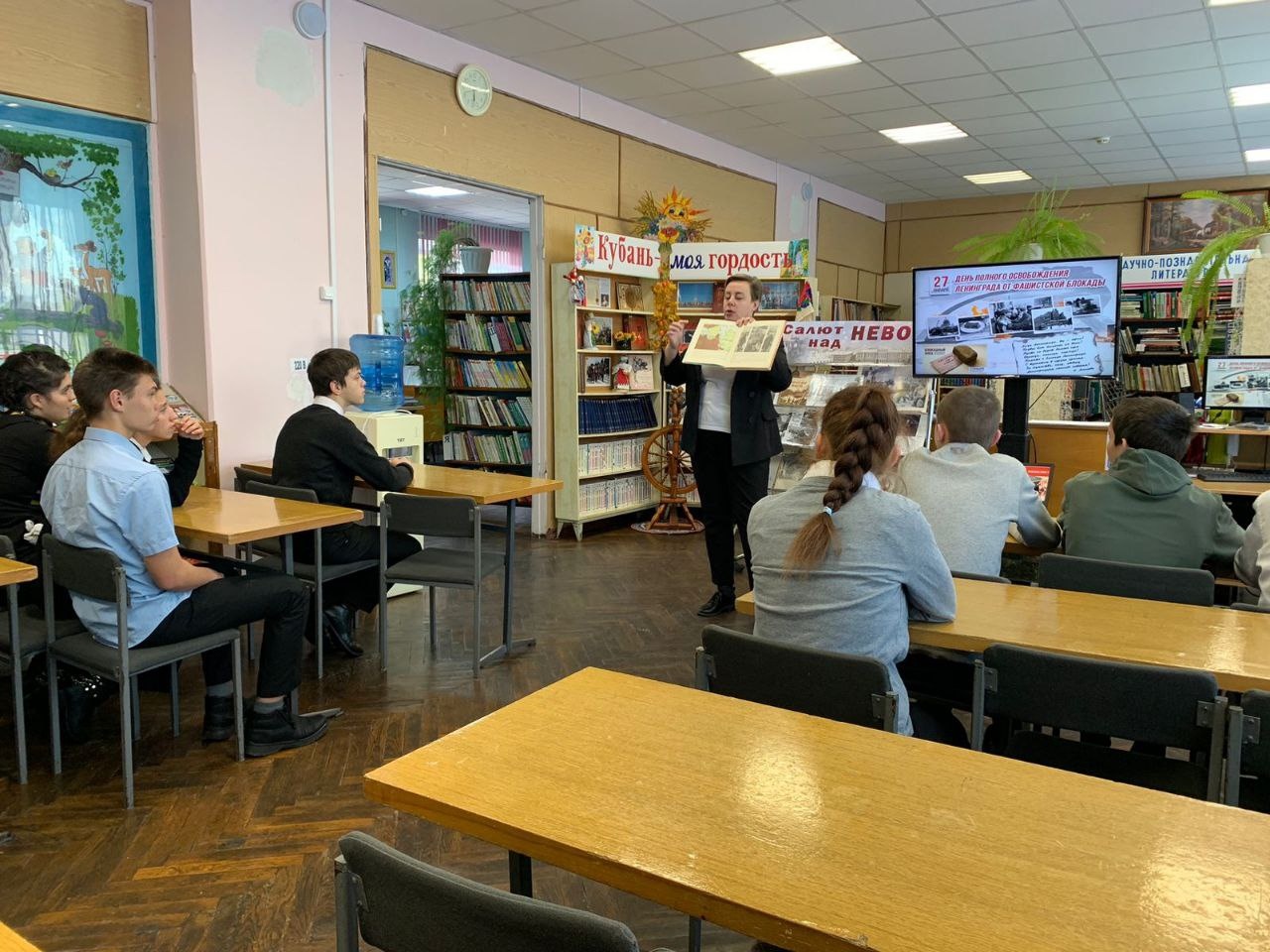 Сегодня учащиеся 9-х классов посетили библиотеку г.Кореновска. Сотрудники библиотеки для учащихся провели урок–реквием «Этих дней не смолкнет слава».