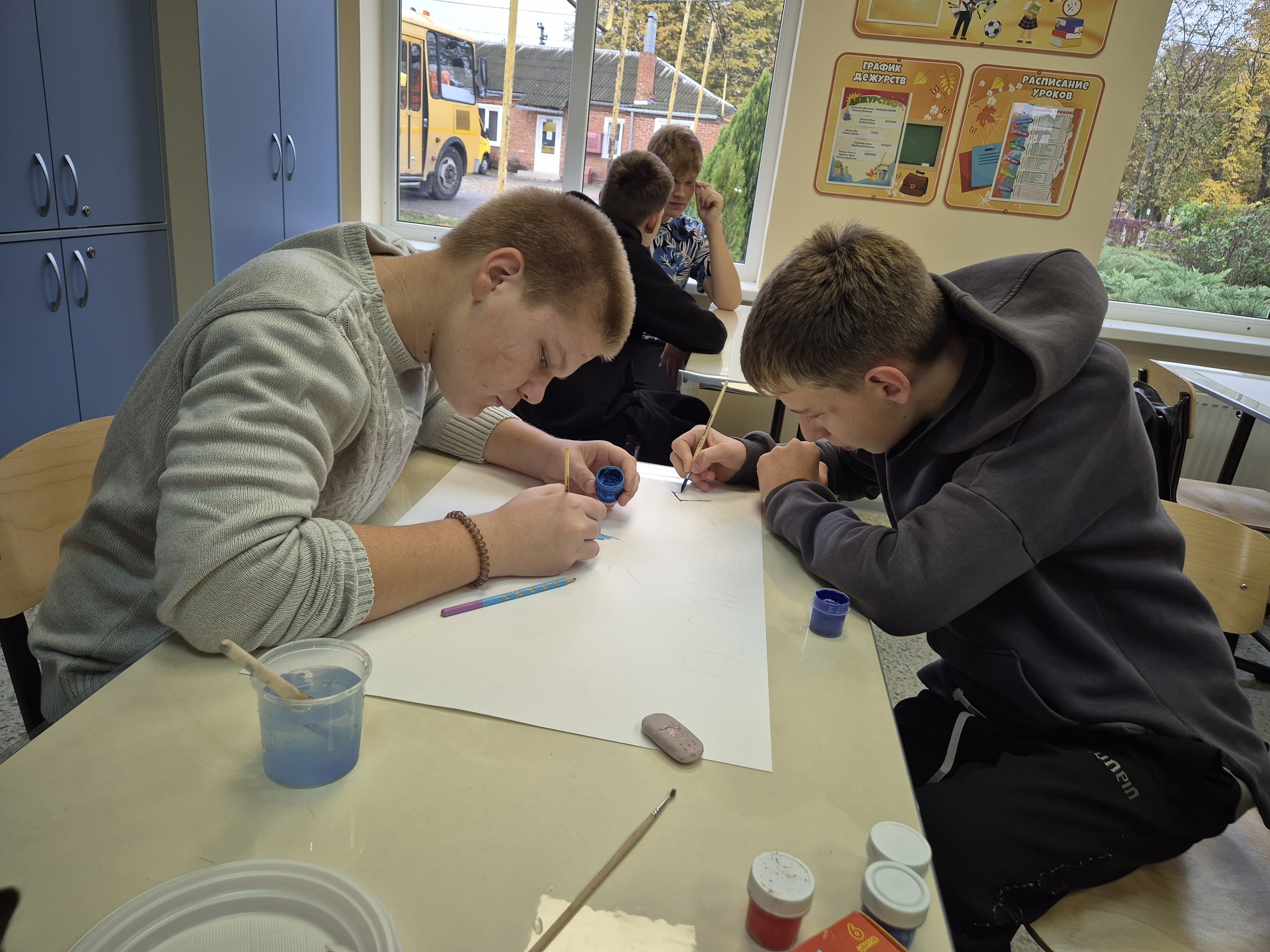Учащиеся 8 «А», с классным руководителем Цыгичко Дарьей Игоревной, оформляют к празднику Дня народного единства окна кабинета и рисуют тематическую стенгазету