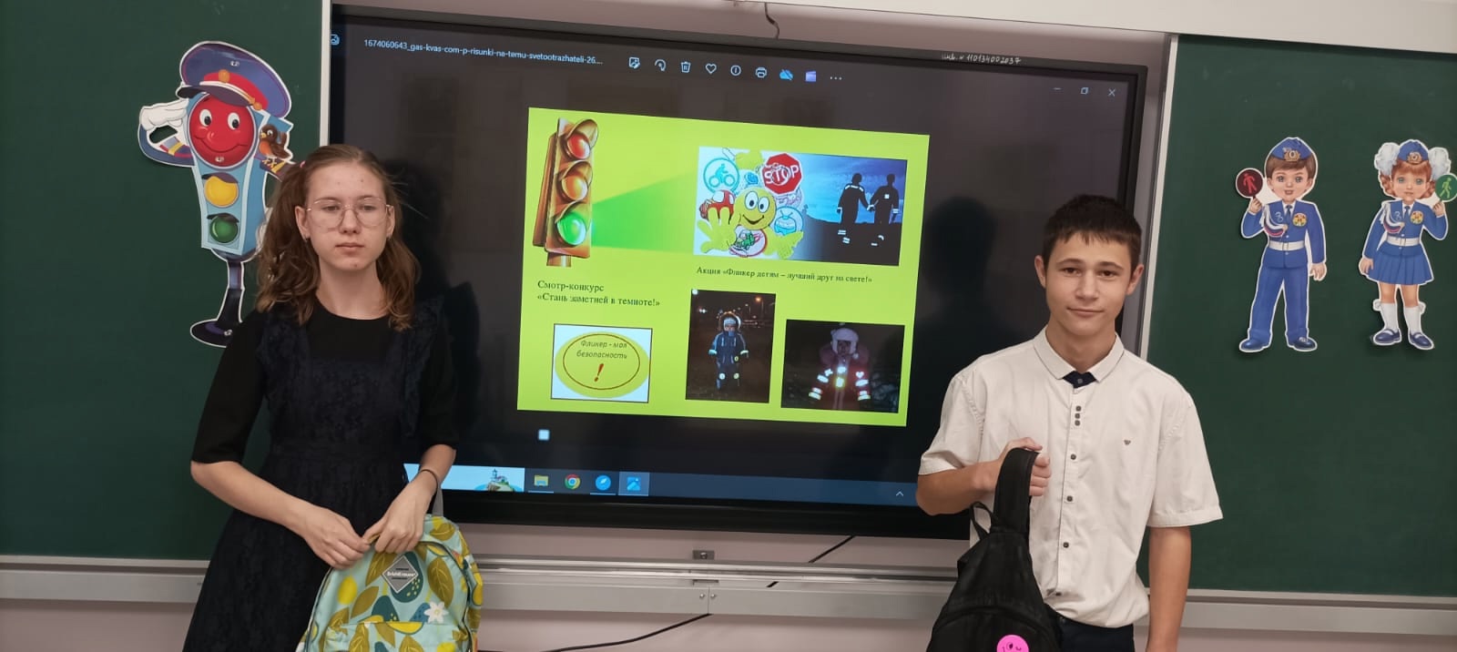 В нашей школе продолжается работа по профилактике детского дорожно-транспортного травматизма. Классные руководители 9 «А», 7 «А» и 6 класса провели занятия, на которых напомнили ребятам о необходимости использования светоотражающих элементов на одежде.