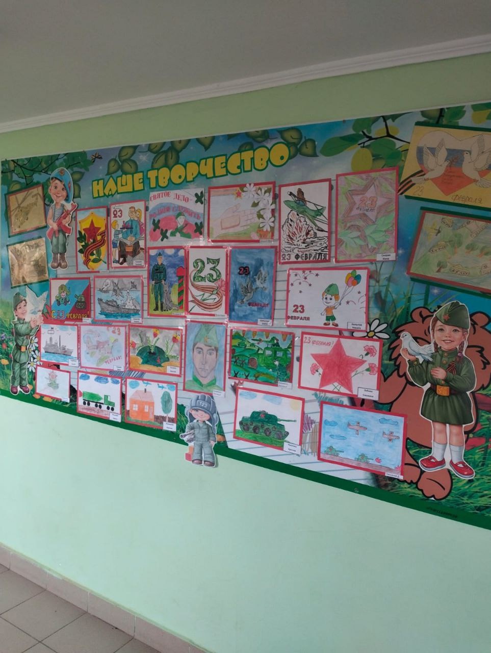 Педагоги начальных классов Полевая И.В., Ермолова С.В., Шевелько О.П. и Кононенко Е.П. оформили тематическую выставку рисунков обучающихся, в рамках месячника патриотического воспитания.