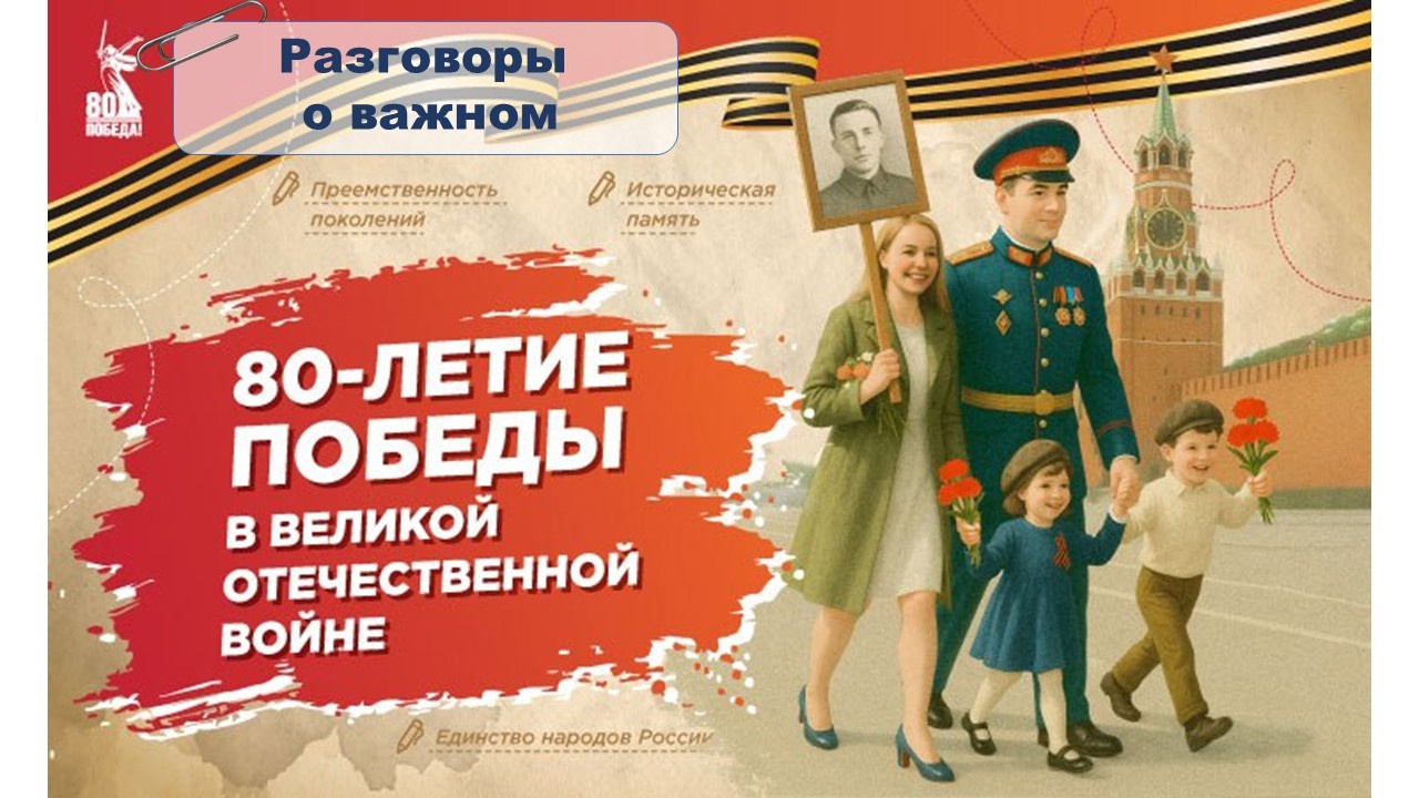 Сегодня в нашей школе прошли традиционные занятия «Разговоры о важном», посвящённые теме: 80-летие Победы в Великой Отечественной войне». Эта дата – не просто историческая веха, но и священный символ мужества, стойкости и героизма советского народа, отстоявшего свободу и независимость Родины в борьбе с фашистскими захватчиками.